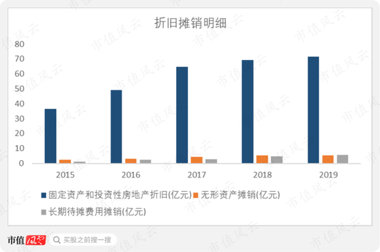 其中,固定资产折旧占主导地位,2019年总折旧费用为71.5亿元。