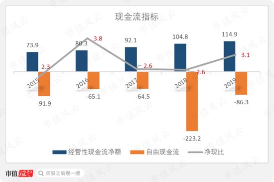 公司经营性现金流稳步增长,2019年达114.9亿元。