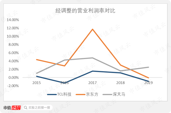 同行业对比,公司的主营业务盈利能力明显逊色于竞争对手,自2015年以来一直如此。2019年,京东方的经调整营业利润率为-0.06%,而深天马为2.52%。