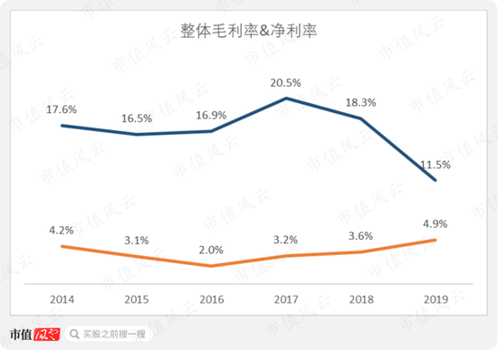 有趣的是,公司的整体毛利率在和净利率出现了趋势上的背离。在整体毛利率严重下滑的情况下,净利率却不降反升,2019年升至4.9%。这要归功于公司对于期间费用的控制能力提升。