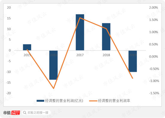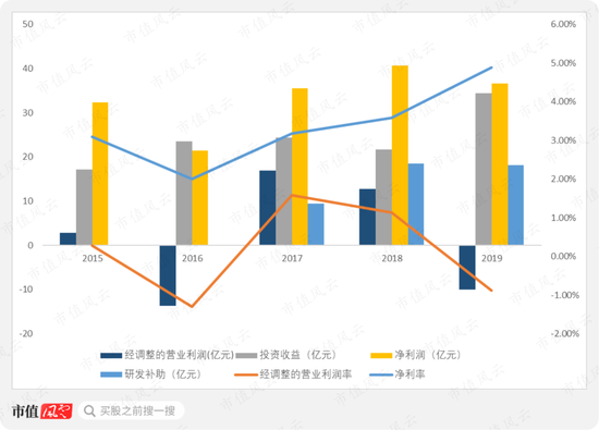 因此造成了如下图所示的情况:2019年公司经调整营业利润-10.05亿元,净利润却达到36.6亿元。