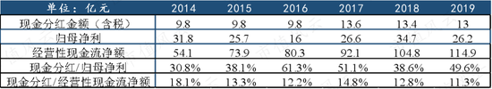 分红方面,公司分红金额较为稳定,2017年以来连续三年都在13亿元出头,2019年派发股利13亿元,占归母净利近一半,占经营性现金流净额的11.3%。