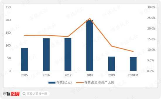公司存货及其在流动资产中占比在资产重组后明显下降,2020年上半年末公司存货价值55.4亿元,占流动资产的比值降至9.2%。