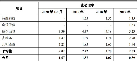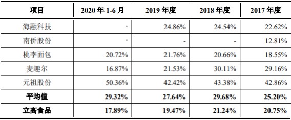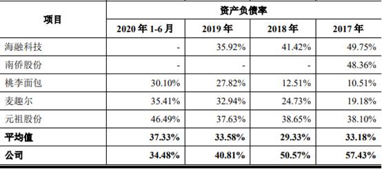 立高食品表示,2017年至2019年,与可比公司相比,公司资产负债率最高,其主要原因为公司处于业务快速发展扩张期,且公司作为非上市公司自身积累仍较薄弱。但报告期内,随着公司经营积累的不断增加,公司的资产负债率持续下降,2020年6月底,公司资产负债率已下降至与行业平均值相当。