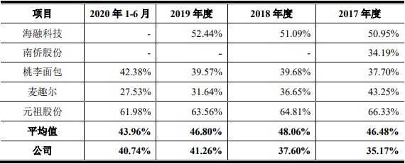 立高食品的主营业务毛利率低于可比公司平均值。2017年至2020年上半年,立高食品的主营业务毛利率分别为35.17%、37.60%、41.26%和40.74%,可比公司的主营业务毛利率平均值分别为46.48%、48.06%、46.80%、43.96%。