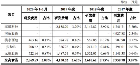 与同行业公司相比,报告期内,立高食品的研发费用率低于海融科技,高于南侨股份、桃李面包、麦趣尔、元祖股份。
