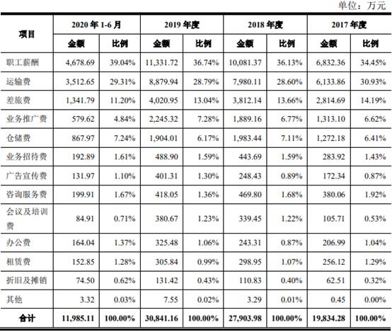 报告期内,立高食品销售费用分别为1.98亿元、2.79亿元、3.08亿元和1.20亿元,占同期营业收入的比重分别为20.75%、21.24%、19.47%和17.89%。报告期内,公司销售费用主要包括职工薪酬、运输费、差旅费、仓储费、业务推广费等,上述费用合计占销售费用的比重分别为92.60%、92.27%、92.03%和91.63%。