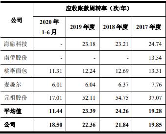 2017年至2020年1-6月,立高食品的应收账款周转率分别为19.85次/年、21.84次/年、22.36次/年、18.50次/年,同行业公司的平均值分别为19.28次/年、24.26次/年、23.39次/年、11.44次/年。