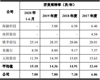 立高食品的存货周转率低于同行业公司平均水平。2017年至2020年1-6月,立高食品的存货周转率分别为6.86次/年、7.38次/年、7.80次/年、7.00次/年,同行业公司平均分别为12.44次/年、14.91次/年、14.36次/年、15.10次/年。