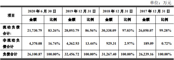 2017年末、2018年末、2019年末、2020年6月末,立高食品的资产总额分别为4.57亿元、6.18亿元、7.95亿元、7.57亿元;负债总额分别为2.62亿元、3.13亿元、3.25亿元和2.61亿元。