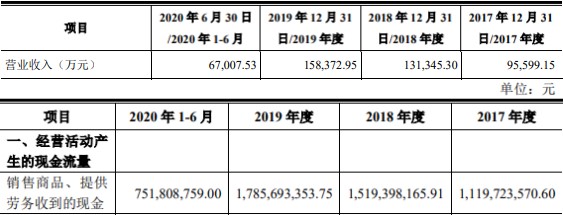 2017年至2020年1-6月,立高食品的营业收入分别为9.56亿元、13.13亿元、15.84亿元、6.70亿元;销售商品、提供劳务收到的现金分别为11.20亿元、15.19亿元、17.86亿元、7.52亿元。