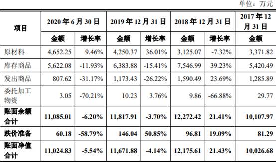 2017年末至2020年6月末,立高食品存货账面净值分别为1.00亿元、1.22亿元、1.17亿元和1.10亿元,占流动资产比例分别为43.02%、39.28%、26.47%和30.40%。存货账面余额分别为1.01亿元、1.23亿元、1.18亿元、1.11亿元。