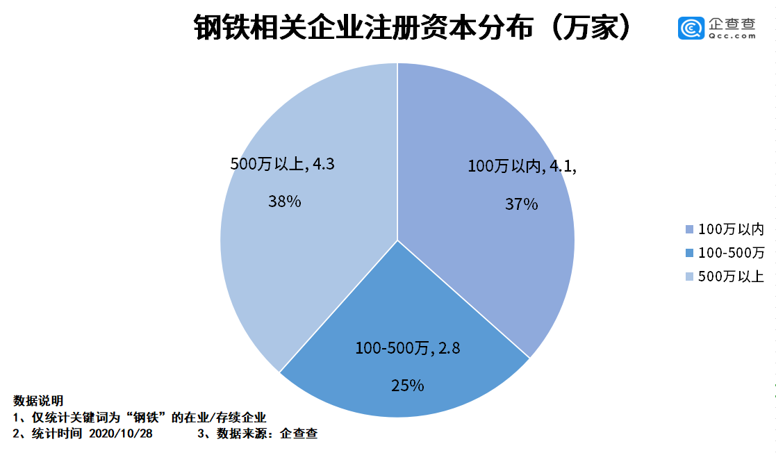 从企业规模来看,企查查数据显示,目前企业注册资本在500万以上的钢铁企业有4.3万家,占比企业总量的38%。企业注册资本在100万以内的企业有4.1万家,占比37%。