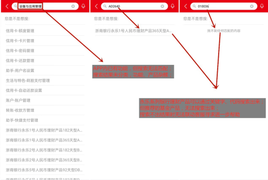 搜索互动方面,浙商银行APP“首页、理财、生活”频道均有“搜索”入口,但搜索体验与同业有较大差距。一是,诸如“身份证更新”等已有功能搜索不出结果;二是,仅支持对银行理财产品的搜索;三是,搜索结果罗列不够清晰;四是,依然无法联动在线客服。