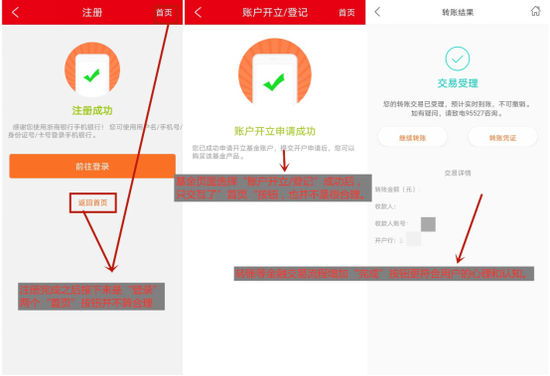 常用操作方面,浙商银行APP用户可以快速找到账户查询、转账汇款、扫码支付等功能入口。常用操作之间进行了交互,但交互水平仍有提升空间:第一,部分交互略像重复且繁杂;第二,部分交互不够合理,比如用户开了基金账户之后跳回首页,不如跳到基金页合理,转账等金融交易旅程结束增加“完成”按钮更符合用户心理和认知。对于用户的常用金融旅程,如何进行克制的合理交互,值得每一家银行APP思索。