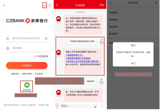 登录方面,浙商银行APP支持手机号、身份证、账号和用户名登录,也支持微信授权快速登录。APP支持手势、指纹和刷脸快捷登录,且登录方式切换便捷,但实测中发现V4.0.23版本暂不支持屏下指纹登录。若用户忘记密码,APP支持在线找回登录密码。