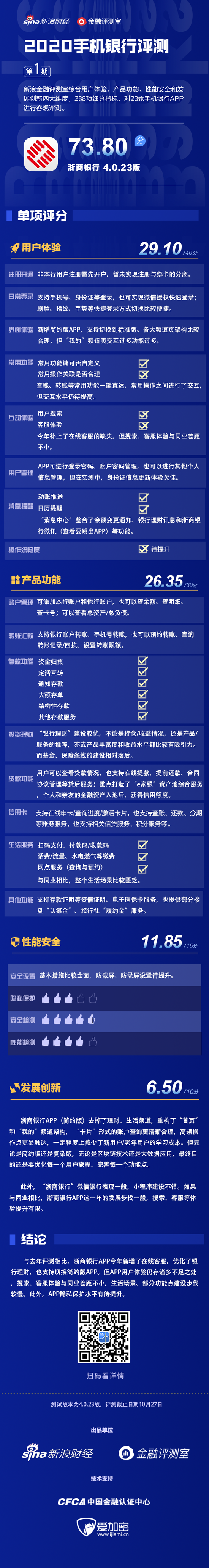 金融评测室综合用户体验、产品功能、性能安全、创新发展4大维度,238项细分指标对浙商银行手机银行APP“浙商银行”进行全扫描,最终给予73.80分(总分100)。