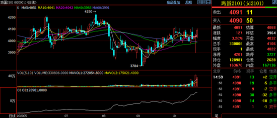 昨日鸡蛋盘中出现戏剧性走势,快速跳水后没多久又一点点的反弹走高,最后收盘收出一根长长下影线探底的阳线,今日鸡蛋继续走高,盘中冲破4100,收盘报4091元/吨,涨幅3.2%。鸡蛋蹦极般的走势背后,基本面如何呢?