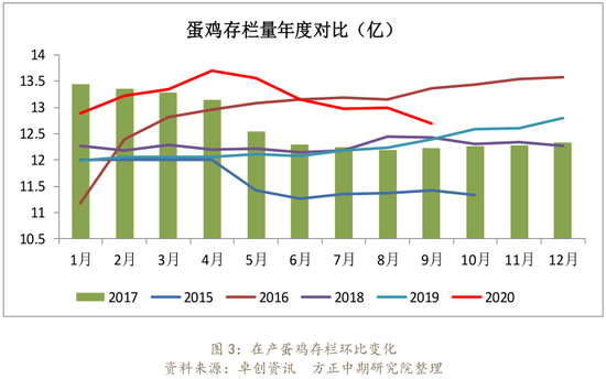 先看淘汰鸡方面的情况,国庆中秋双节前后,由于鸡蛋价格上涨力度不大,多数养殖户进行了顺价淘汰,由于去年补栏量较大,现在淘汰的老鸡都是那个时候进行的补栏,淘汰鸡出栏量有较为明显的增加。9月份的在产蛋鸡存栏因此出现了环比回落。
