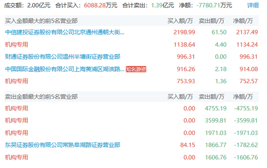盘后龙虎榜显示,机构大举出逃,资金净流出7780万。席位方面,买二、买五 2家机构合计买入1886万,卖一、卖二、卖三、卖五4家机构合计爆卖11931万。