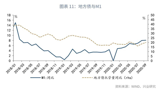 在M1方面,地方债发行和经济回暖均能带动企业活期存款增长。10月地方债余额同比或进一步提高,且经济总体延续复苏态势,M1同比有望继续回升。