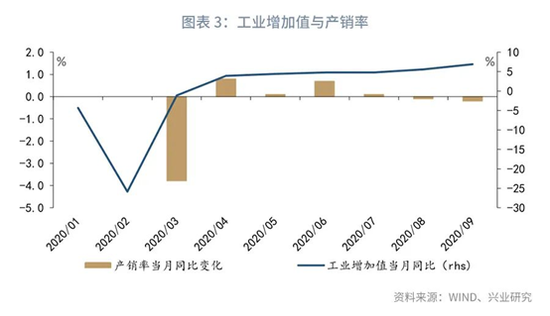 9月工业增加值同比大幅上升至6.9%,但这一增速或难以持续。9月的工业增加值同比增速已经显著高于2019年全年的5.7%,而消费需求尚未恢复到去年的水平。因此,在9月工业生产同比加快的同时,工业企业产销率同比降幅扩大,影响了工业生产提速的可持续性。加之10月工作日较去年同期少2天,10月工业增加值同比增速或明显回落。