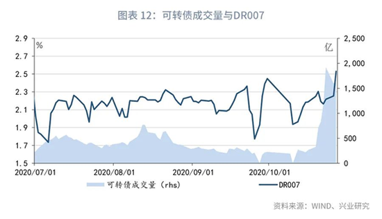 这种现象可能与近期可转债交易火爆有关。10月22日可转债成交量突破1000亿,并连续4日保持在1000亿之上。随后的10月23日证监会发布《可转换公司债券管理办法(征求意见稿)》(以下简称“征求意见稿”),加强对可转债市场的规范与引导。由此来看,资金面的收紧和征求意见稿的发布可能是引导可转债市场健康发展的“组合拳”。