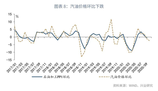 在工业品方面,10月中上旬成品油价格环比下跌,动力煤价格环比继续上涨。同时,10月PPI同比翘尾较上月下降0.1个百分点。总体来看,10月PPI同比可能与上月持平。