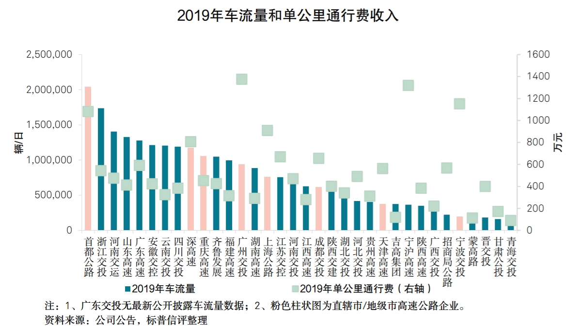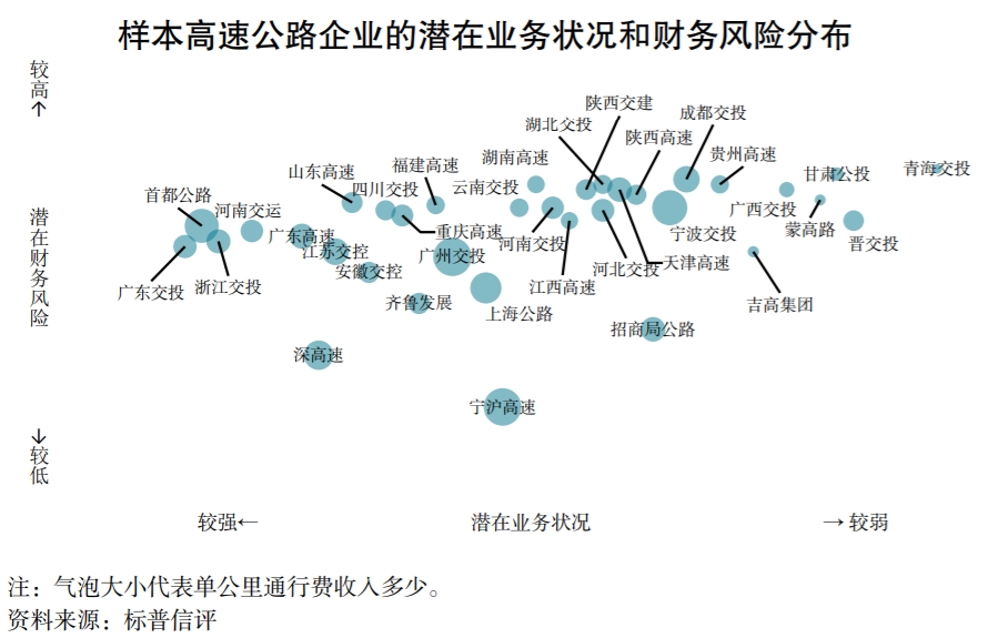 青海交投、甘肃公投、蒙高速等由于原有路产和未来建设投资规模大,导致通车里程长而车流量少,通行费收入低,他们潜在的业务状况和财务风险两方面均处于行业较弱的水平。