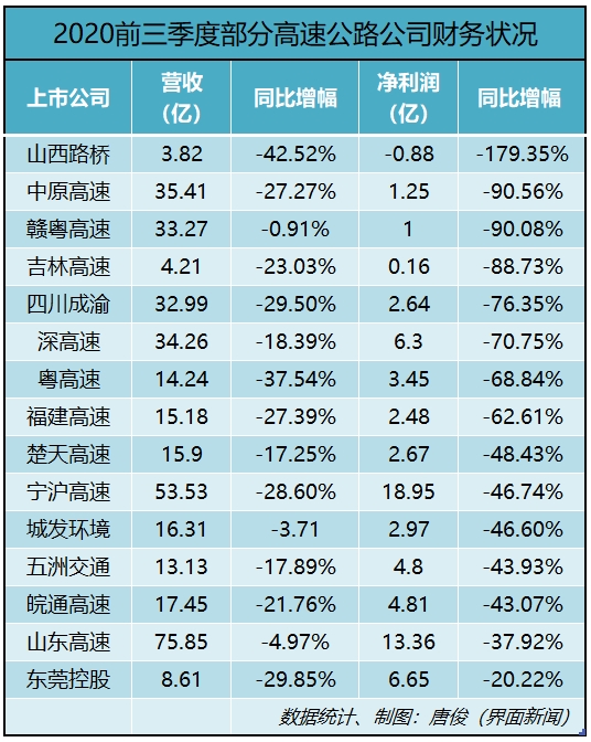 今年上半年,高速公路免费通行了近80天,导致高速公路企业营收及利润大幅下降。8月底时,界面新闻统计了19家高速公路上市公司财报。上半年,19家公司中有14家营收下降超过三成,7家企业出现亏损。
