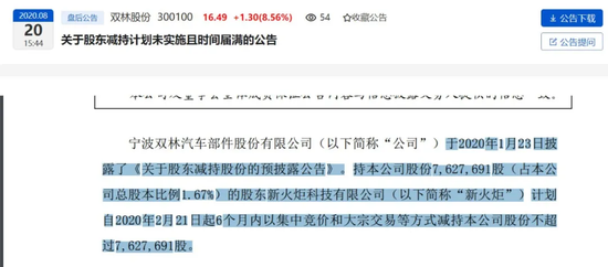 由于被立案调查,新火炬剩余股份的减持计划似乎受到了影响。8月20日,双林股份披露,新火炬预披露的股份减持计划减持时间已届满,其未减持本公司股份。