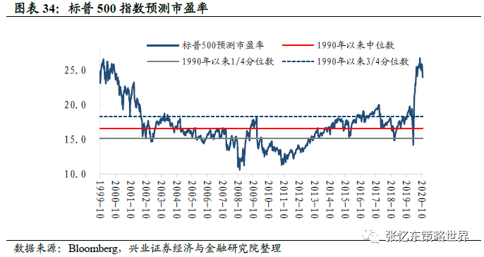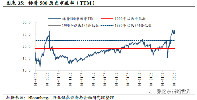 标普500市盈率(TTM)为25.2倍,低于上周五的26.7倍,高于1990来的3/4分位数。