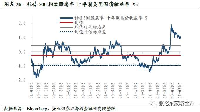 截至10月30日,标普500指数股息率为1.84%,十年期美国国债收益为0.87%,标普500指数股息率与十年期美国国债收益率之差为0.96%,高于2010年以来的均值+1倍标准差,处于2010年以来的相对高位水平。