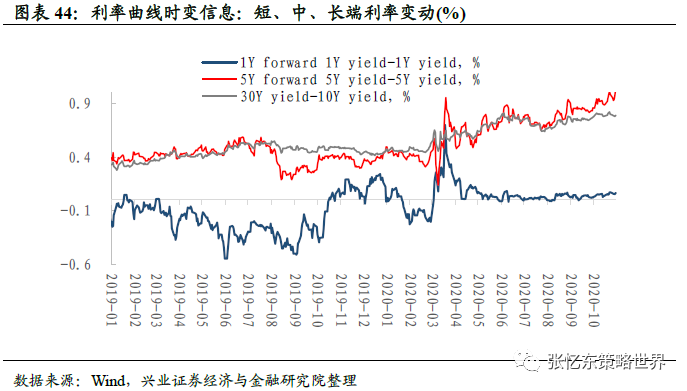 (注:短期货币政策预期,即1Y forward 1Y yield-1Yyield,指的是1年后的1年期国债到期收益率与当前时点1年期国债到期收益率的差,反映了短期(1年期)货币政策预期。同理,5Y forward 5Y yield-5Y yield(中期增长和通胀预期)指的是5年后的5年期国债到期收益率与当前时点5年期国债到期收益率之差,反映中期增长和通胀预期。)