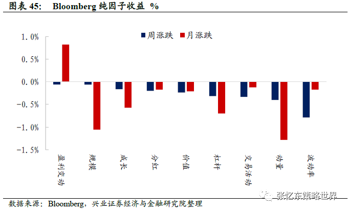 纯因子收益:本周,所有因子收益均下跌,波动率、动量和交易活动因子领跌。近一月,盈利变动因子占优,动量和规模因子跑输。