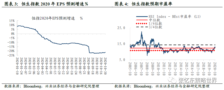 截至10月30日,恒生指数2020年EPS预测增速为-21.5%。
