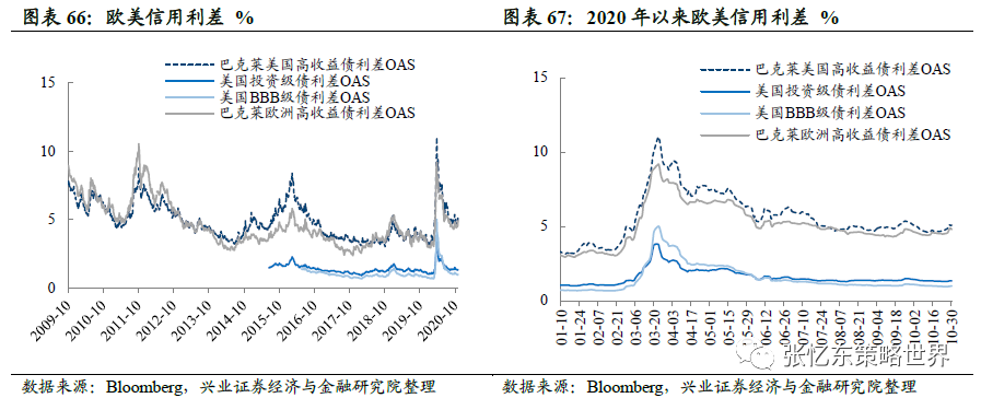 欧美企业债信用利差:截至10月30日,相较于上周收盘,巴克莱美国高收益债利差OAS上升41bp至5.1%,美国投资级债利差OAS上升4bp至1.4%,美国BBB级债利差上升3bp至1.0%,巴克莱欧洲高收益债利差OAS上升31bp至4.8%。