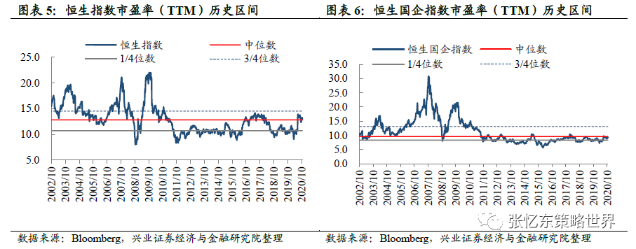 恒生指数当前PE(TTM)为12.9倍,恒生国指PE(TTM)为9.1倍,二者均处于2002年以来的中位数附近。