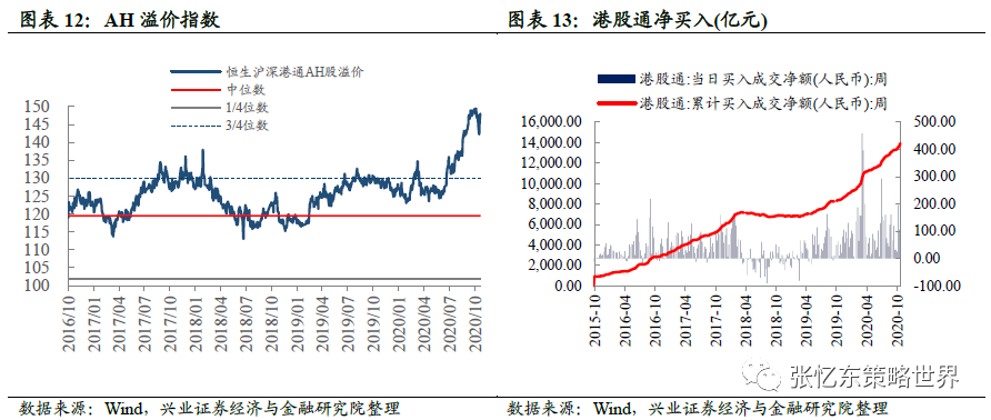 本周港股通成交占主板成交金额的比重为10.9%,高于上周的8.6%。截至10月30日,AH溢价指数为147.9,高于上周的144.3,高于2005年以来的3/4分位数,处于近四年以来的高位水平。