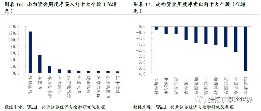 南向资金周度净买入前十大个股为腾讯控股、美团-W、香港交易所、中芯国际、比亚迪股份、中国人寿、建设银行、思摩尔国际、小米集团-W、汇丰控股;净卖出前十大个股为工商银行、长城汽车、微创医疗、中国神华、颐海国际、中兴通讯、招商银行、万洲国际、中国平安、比亚迪电子。