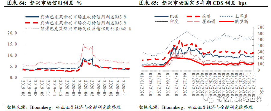 新兴市场国家CDS利差:相较于上周五,本周以来,土耳其5年期CDS利差上升44.0bps至558.5bps,巴西上升5.8bps至218.2bps,俄罗斯上升12.3bps至105.8bps,印度上升3.9bps至87.1bps,南非上升14.2bps至280.8bps,墨西哥上升6.2bps至127.8bps。