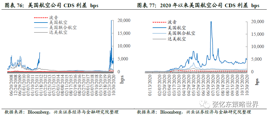 美国航空公司CDS利差:相较于上周五,本周波音公司上升27.9bp至282.0bps; 美国航空上升1613.9bp至5020.4bps;达美航空上升89.2bp至635.4bps;美国联合航空上升130.3bp至1100.4bps。