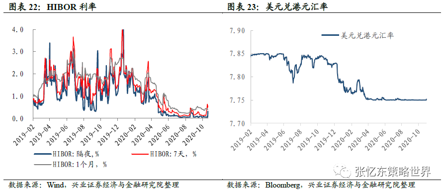 货币市场利率:截至10月30日,相较于上周五,本周HIBOR隔夜利率上升26.6bp至0.32%,7天利率上升43.3bp至0.57%,1个月利率下降3.6bp至0.40%。