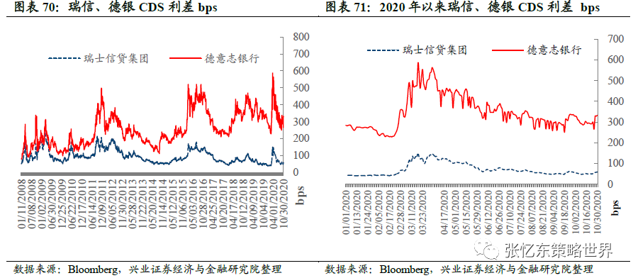 瑞信、德意志银行CDS利差:相较于上周五,本周瑞信CDS利差上升9.5bp至59.2bps;德意志银行CDS利差上升40.8bp至333.0bps。