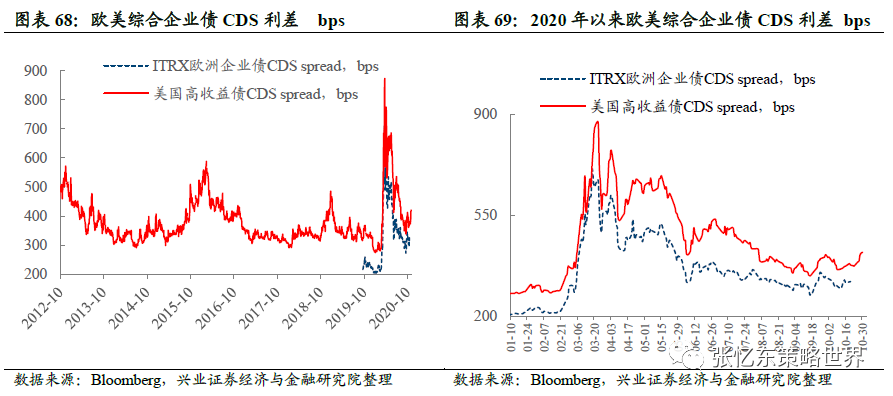 欧美综合企业债CDS利差:相较于上周收盘,美国高收益债CDS上升 47.8bps至421.1bps。