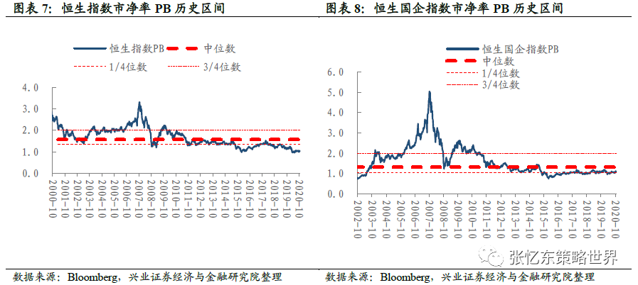 恒生指数当前市净率水平为1.0倍,恒生国指市净率为1.1倍,二者处于2002年以来的1/4分位数附近。