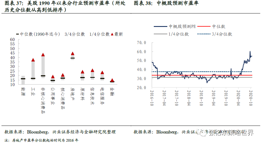(注:括号内百分比数值为对应行业预测市盈率于1990年以来的分位数)。