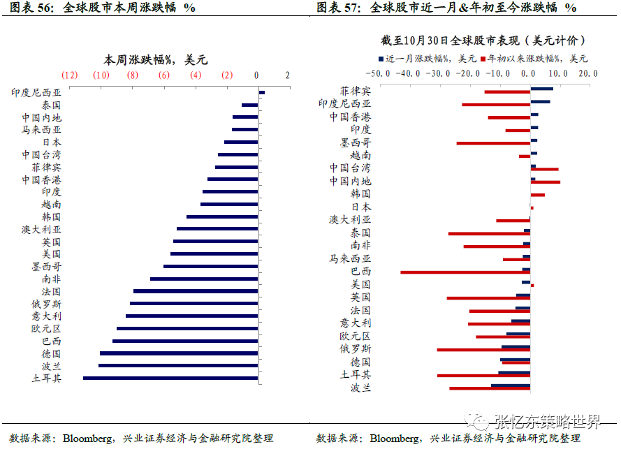 2)股票市场:本周仅印度尼西亚(涨0.5%)股市上涨,土耳其(跌11.2%)、波兰(跌10.2%)和德国(跌10.1%)股市领跌;