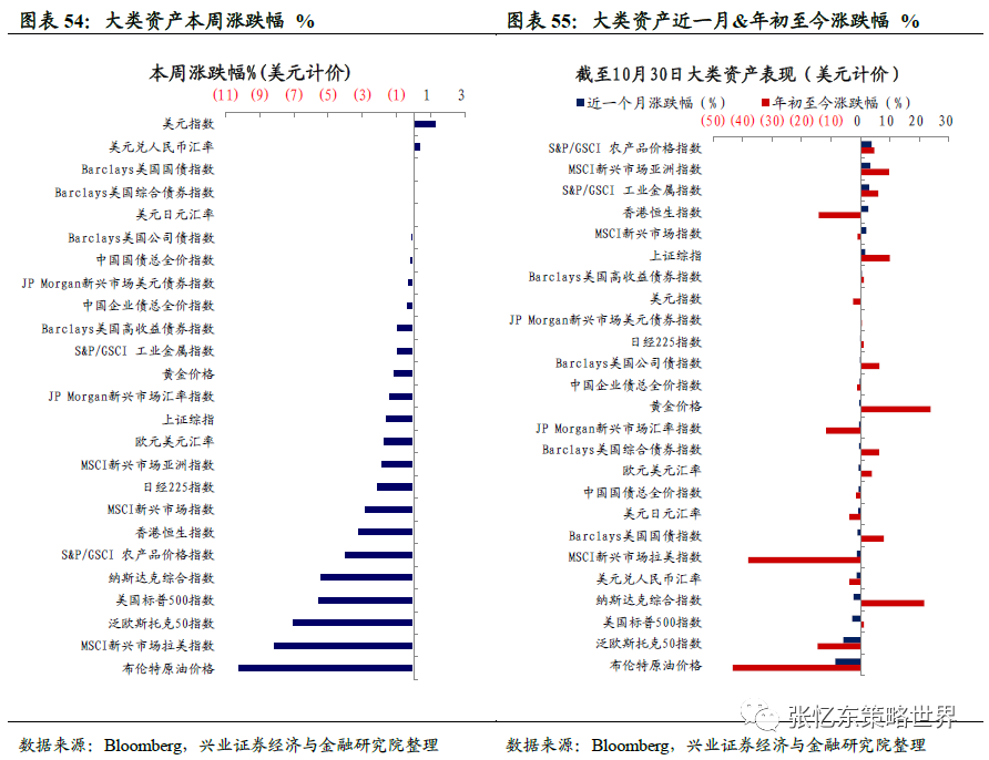 跨资产:债券>工业金属>黄金>农产品>股票>原油;股票市场:本周仅印度尼西亚股市上涨,土耳其、波兰和德国股市领跌;债券市场:除美国外,本周海外主要发达国家/地区10年期国债收益率均下降,意大利10年期国债收益率下降6.3bp,美国10年期国债收益率上升3.0bp;大宗商品:工业金属表现优于黄金、农产品和原油。本周布伦特原油价格下跌10.3%,黄金价格下跌1.2%;汇率:本周美元指数涨1.4%。