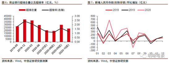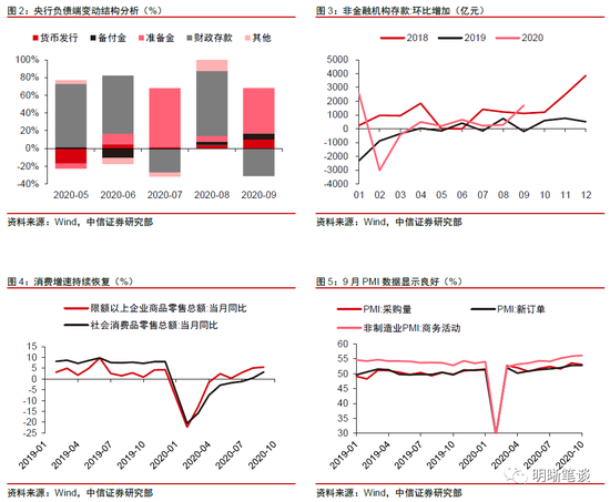 现金高增能否持续:预计现金逐渐回流。从过往经验看,商业银行所持有的库存现金变动并不明显,而各类节假日对居民持有现金总额的影响很大:今年春节后由于疫情的影响,有大量节前被居民支取的现金无法通过消费或存款回流,导致3月、4月该项增加多;而9月末临近“十一”国庆假期,居民外出旅游以及假期消费往往会提升取现需求,受此影响,9月“财政+货币”投放的流动性中有大约2600亿元形成了现金从而离开了银行体系。而随着假期的结束以及“双11”网络购物节的到来,居民消费需求将更多的转向线上。那么银行间流动性会受此利好吗?我们仍然需要关注“备付金”的影响。